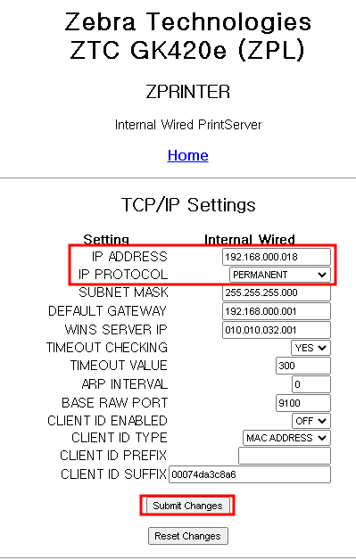 게이트웨이와 SUBNET을 입력한 다음 "Submit Changes"를 클릭한다.