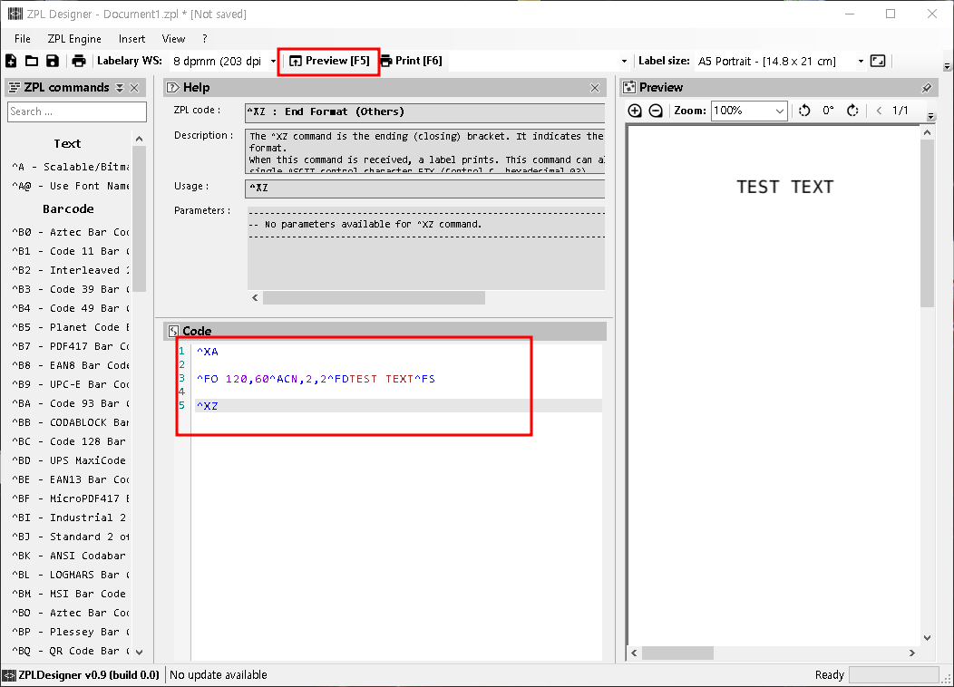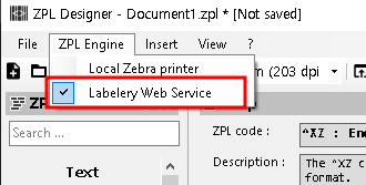 혹시나 Preview[F5] 버튼이 활성화되지 않으면 "ZPL Engine" 메뉴에서 아래 그림과 같이 선택하면 프리뷰가 될 것입니다.