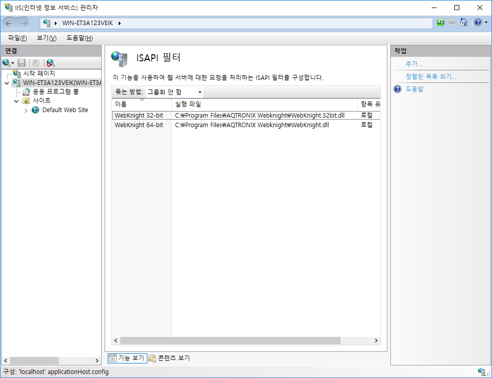 속성에서 “ISAPI 필터” 탭에 다음과 같이 WebKnight 필터가 정상적으로 적용이 된 것을 확인할