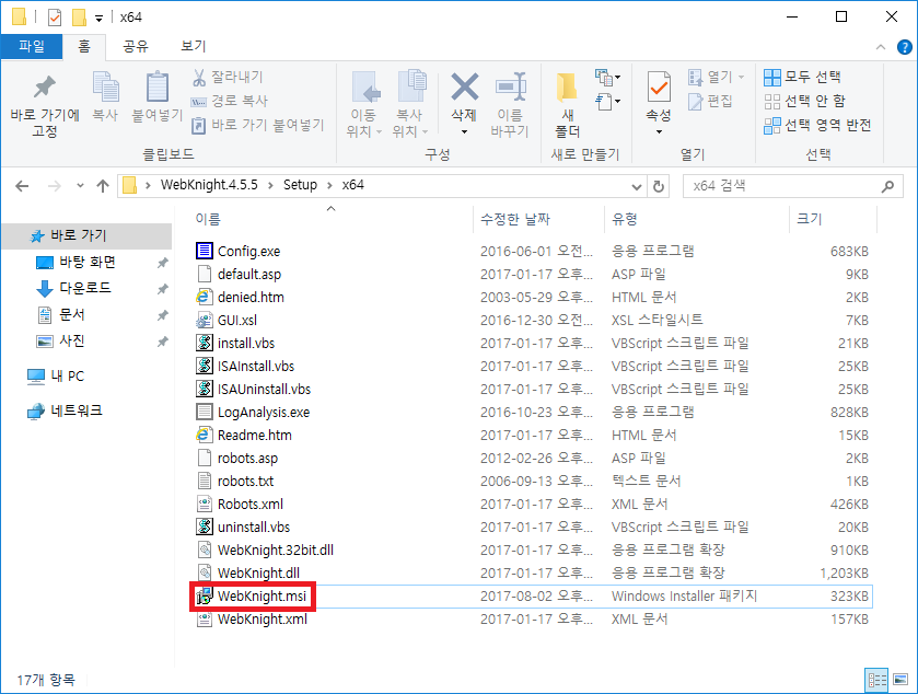 - 압축을 푼 뒤 사용자의 시스템 종류에 맞는 폴더의 WebKnight.msi를 실행하여 설치를 진행합니다.