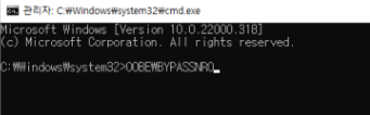 2)아래 그림과 같이 "OOBE\BYPASSNRO"를 입력 후 엔터!!
