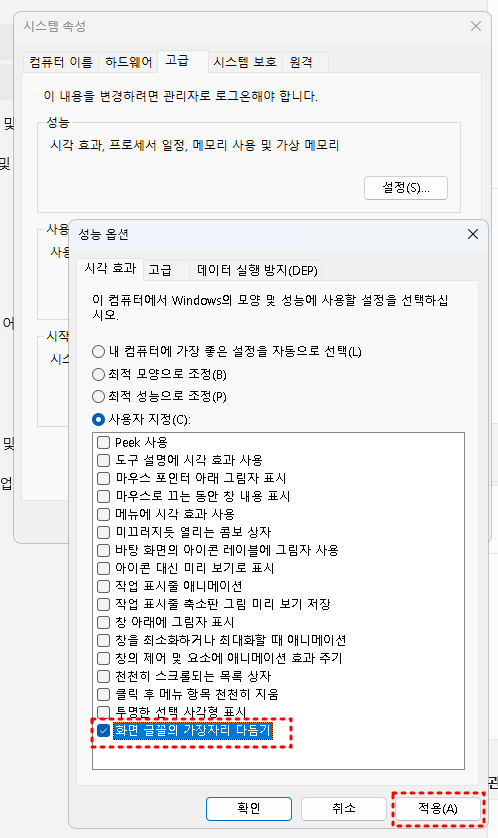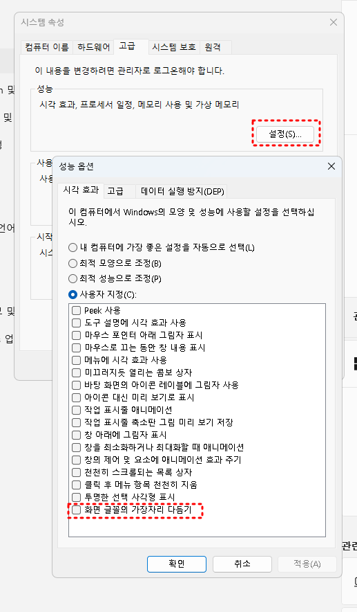 그러는 순간... 저번주 금요일 PC 성능 향상을 위해 옵션을 건드린 게 기억이 났다.